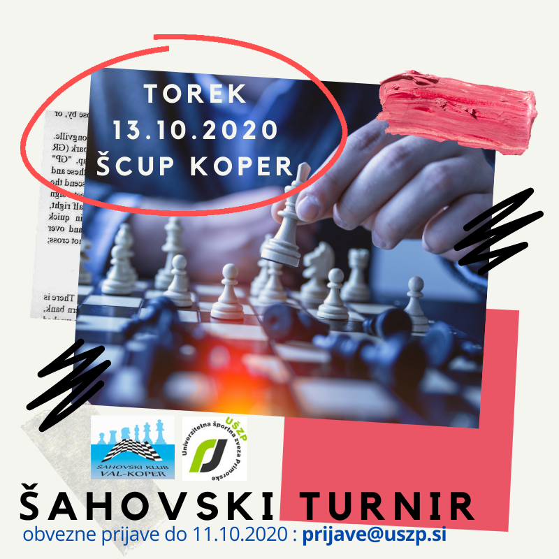 V sodelovanju s Šahovskim klubom Val Koper, se bo v torek, 13. 10. 2020, v Študentskem centru Univerze na Primorskem, odvijal študentski turnir v hitropoteznem šahu, ki bo primeren za vsakogar. Pričel se bo ob 19. uri, udeležba je brezplačna!
